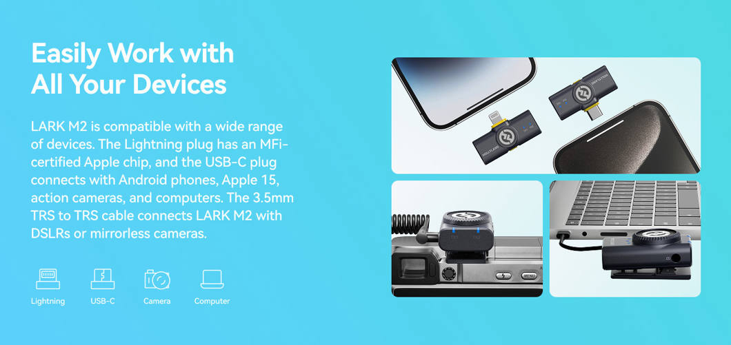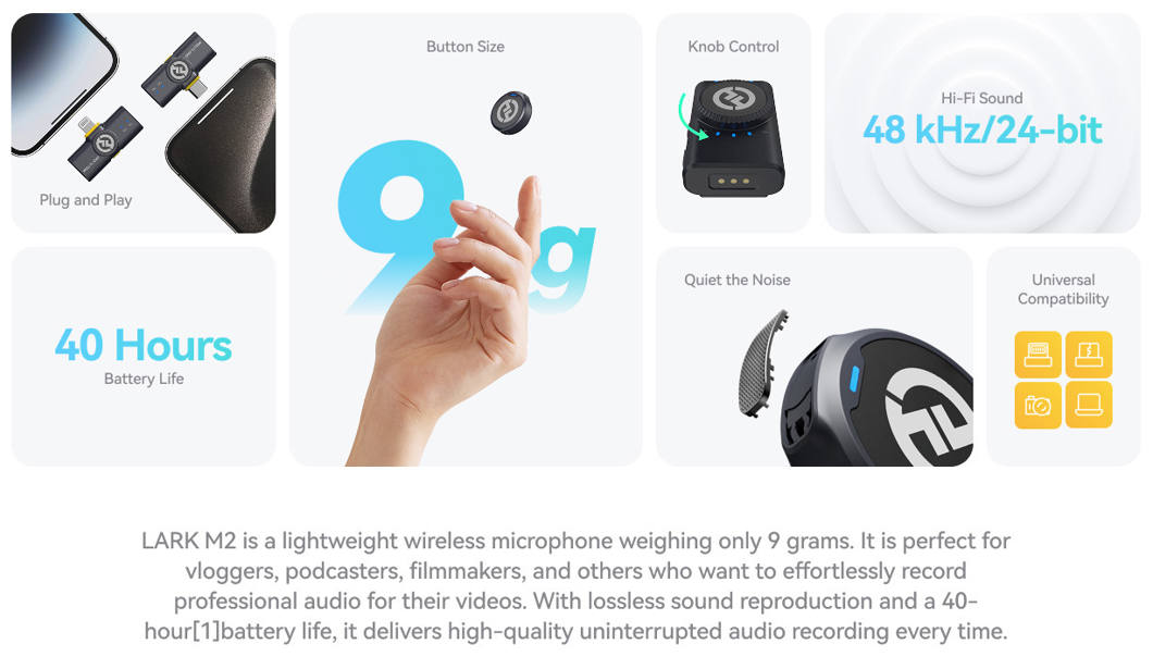 With plug-and-play pairing, dual-receiver flexibility and professional wireless performance in a pocket-size form factor, the LARK M2 Camera & USB-C Combo is engineered for creators working seamlessly across camera and mobile production platforms.