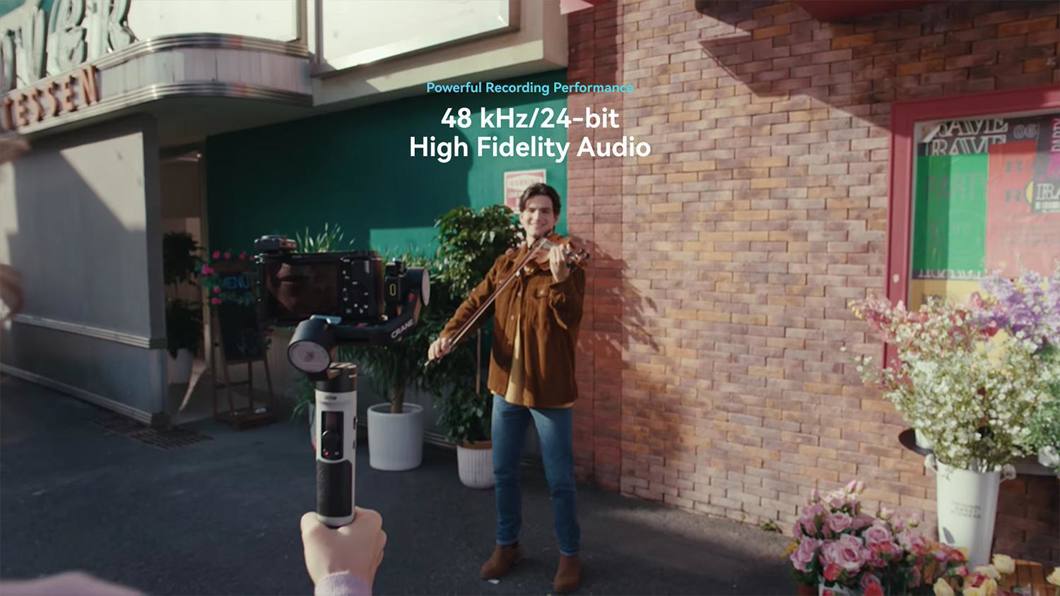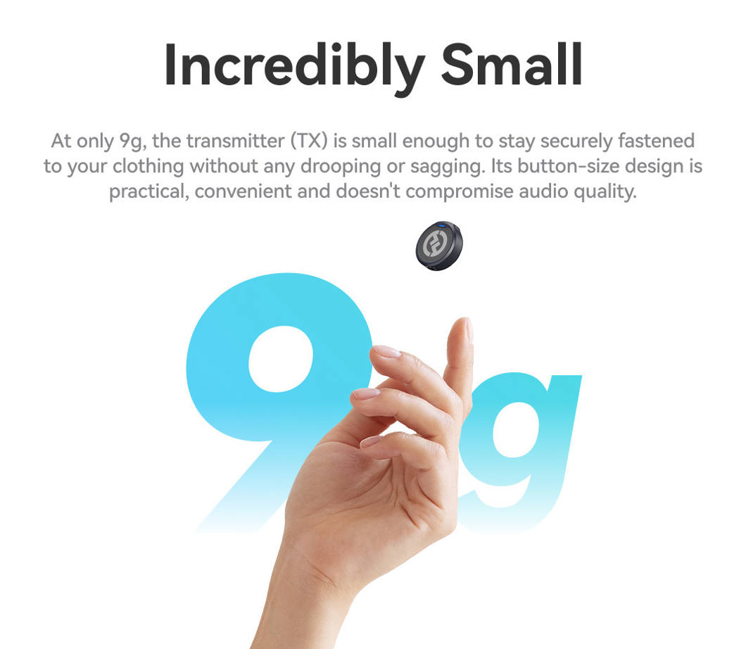 The ultra-lightweight transmitters (approx. 9 g) integrate omnidirectional microphones with 48 kHz / 24-bit digital audio, 20 Hz–20 kHz frequency response and high SPL handling, providing clear, natural voice reproduction suitable for video production, interviews and streaming.