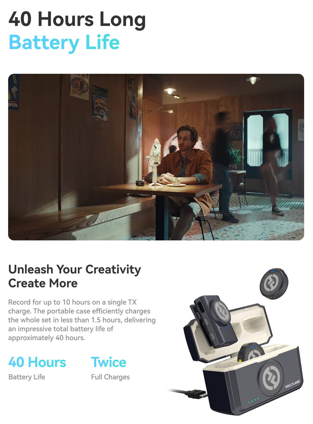 Each transmitter operates for up to 10 hours per charge, while the included charging case provides multiple full system recharges for up to 40 hours total runtime, supporting extended shooting sessions and field workflows.