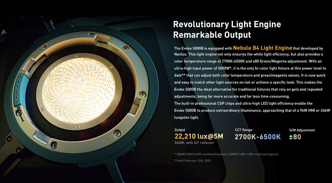 Introducing the Nanlux Evoke 5000B, the world’s first 5000W stormproof LED bi-color spotlight with Green/Magenta adjustment. Built for the most demanding film and television productions, the Evoke 5000B delivers unmatched power, precision, and weather resistance. Designed to replace traditional high-output fixtures, it redefines professional lighting with its exceptional intensity, fine-tuned color control, and rugged all-in-one design.