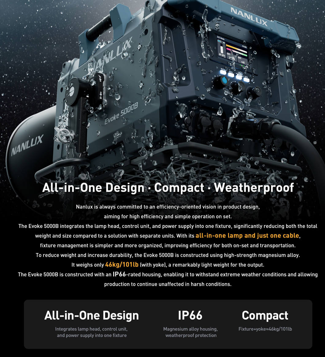 Weighing only 46kg with the yoke, the Evoke 5000B combines lamp head, control unit, and power supply in one durable magnesium alloy housing. Its IP66-rated build withstands rain, dust, and extreme humidity, offering peace of mind during outdoor or on-location shoots. From harsh weather to tight schedules, this light is built to perform—anywhere.