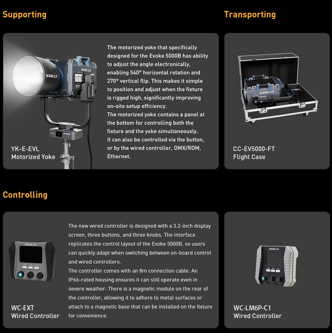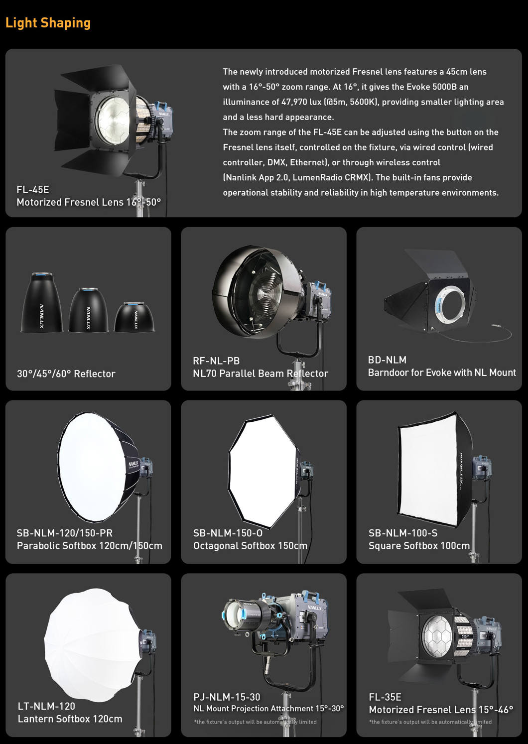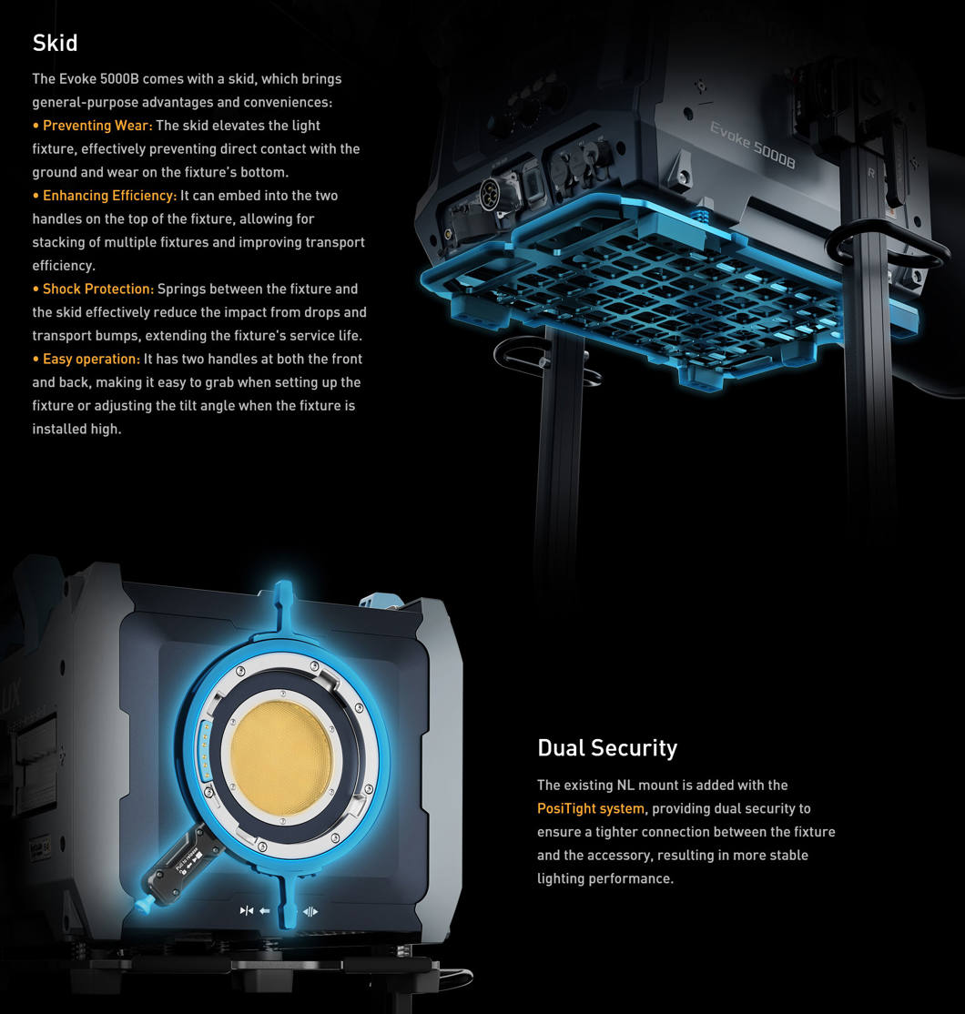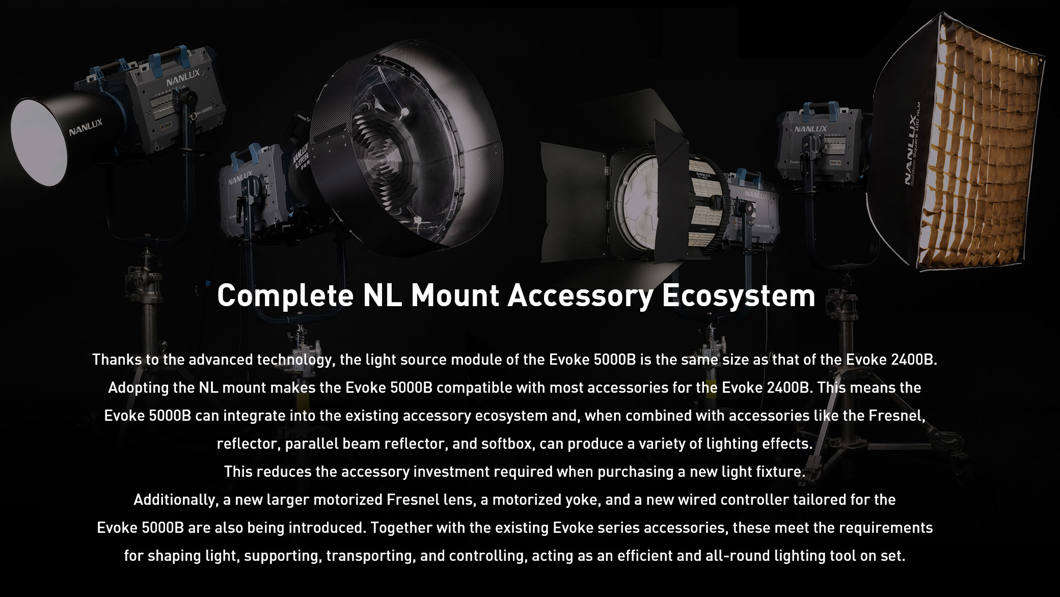 Using the NL mount system, the Evoke 5000B is compatible with an array of existing Evoke accessories, including the new high-output 30° reflector, Fresnels, softboxes, and more—making it easier than ever to build a flexible, professional lighting kit without starting from scratch.